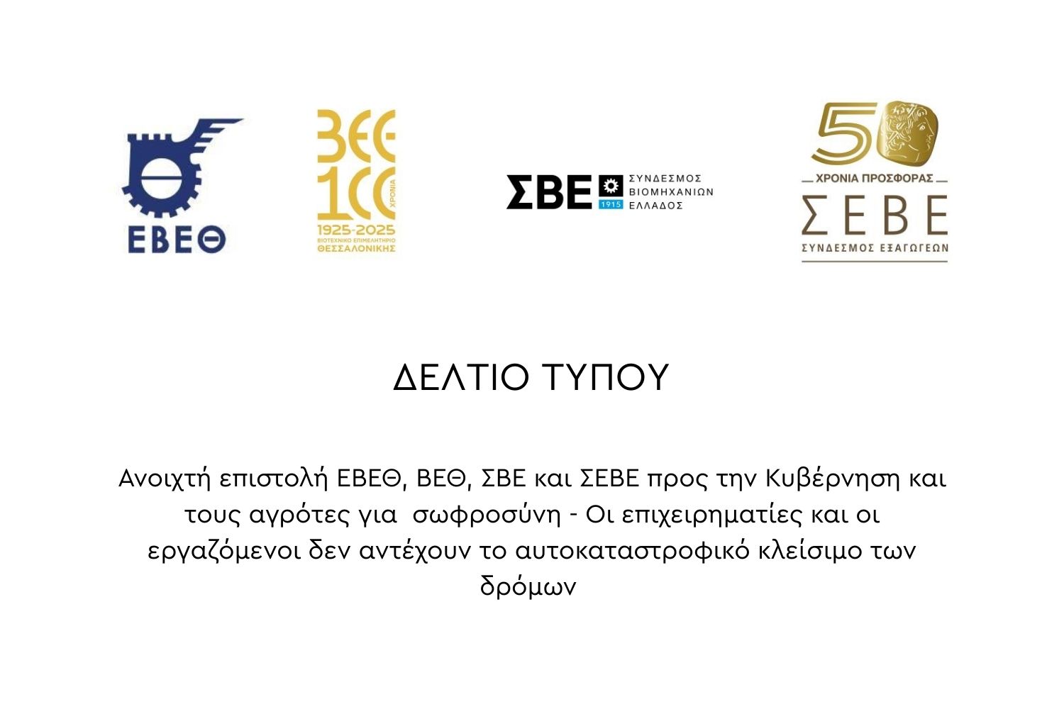 Το ΕΒΕΘ, το ΒΕΘ, ο ΣΒΕ και ο ΣΕΒΕ καλούν την Κυβέρνηση και τους αγρότες καθώς και -κατά περίπτωση- οποιαδήποτε άλλη επαγγελματική ομάδα να αναλάβουν ο καθένας τις ευθύνες του και να αναζητήσουν με σύνεση και ψυχραιμία μέσα από ένα ουσιαστικό διάλογο την καλύτερη δυνατή λύση, με ανοιχτούς όμως δρόμους ώστε να αποφευχθούν οι περαιτέρω αρνητικές συνέπειες, ιδιαίτερα κατά τη συγκεκριμένη χρονική περίοδο ενόψει των εορτών και των αυξημένων αναγκών σε διακίνηση ανθρώπων και εμπορευμάτων.