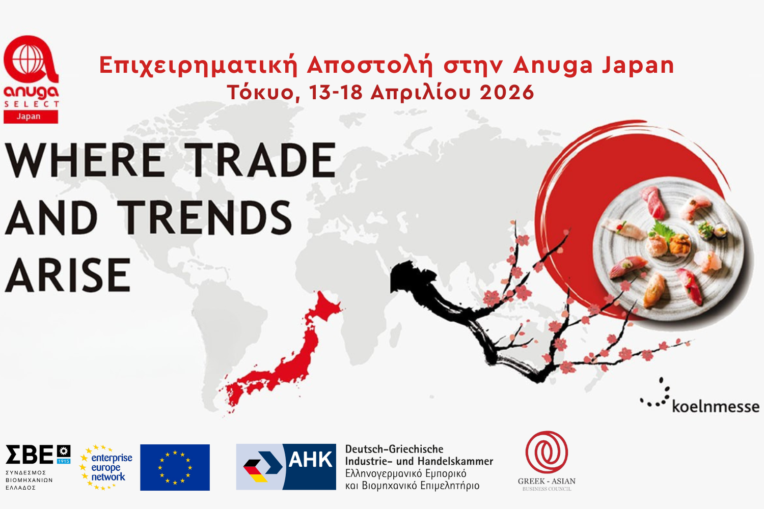 Ο Σύνδεσμος Βιομηχανιών Ελλάδος (ΣΒΕ), μέλος του δικτύου Enterprise Europe Network (EEN), σε συνεργασία με το Ελληνογερμανικό Εμπορικό και Βιομηχανικό Επιμελητήριο και το Ελληνο-Ασιατικό Επιχειρηματικό Συμβούλιο, διοργανώνουν Επιχειρηματική Αποστολή εταιριών τροφίμων & ποτών, στο Τόκυο, Ιαπωνία από 13 μέχρι 18 Απριλίου 2026, με αφορμή τη διεθνή Έκθεση τροφίμων Anuga Japan, η οποία εντάσσεται στο δίκτυο των καταξιωμένων Εκθέσεων Anuga του Εκθεσιακού Οργανισμού Κολωνίας.
