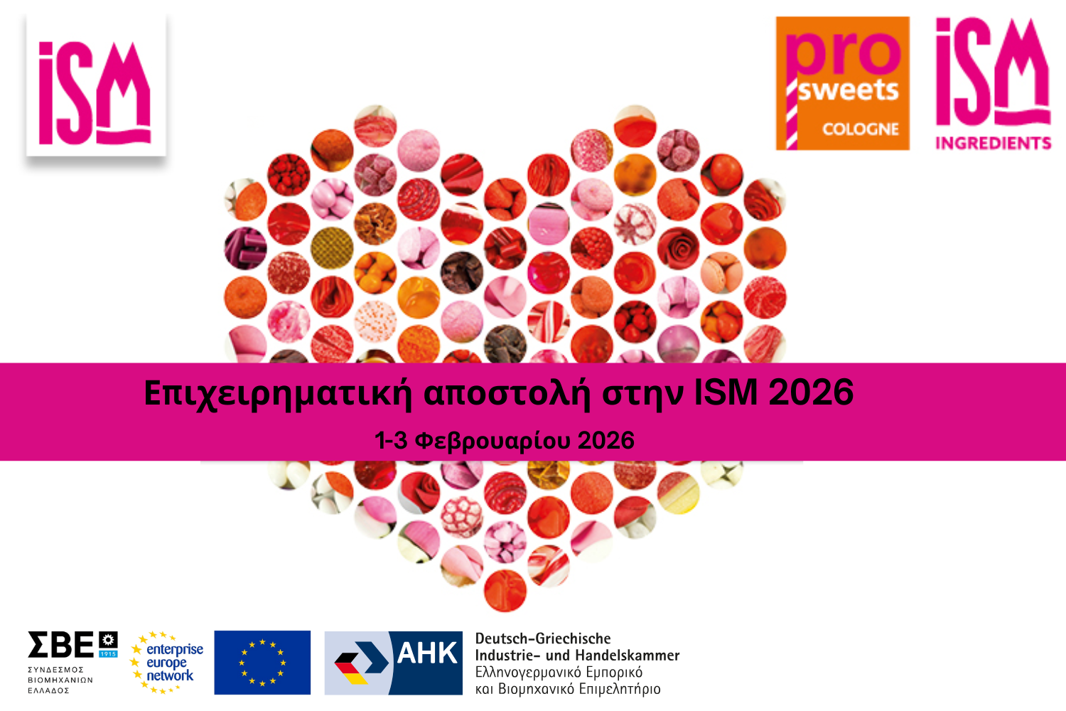 Ο Σύνδεσμος Βιομηχανιών Ελλάδος, μέλος του δικτύου Enterprise Europe Network (ΕΕΝ), σε συνεργασία με το Ελληνογερμανικό Επιμελητήριο, διοργανώνουν επιχειρηματική αποστολή στη Διεθνή Έκθεση Ζαχαρωδών & Σνακ ISM Cologne 2026, στη Κολωνία από 1 έως 3 Φεβρουαρίου 2026.