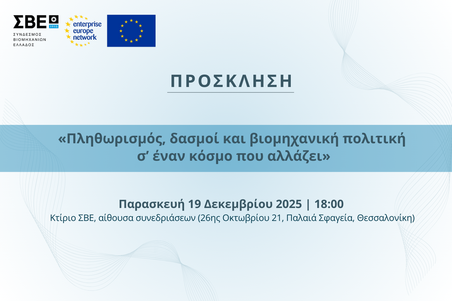Την Παρασκευή 19 Δεκεμβρίου 2025, ο Σύνδεσμος Βιομηχανιών Ελλάδος (ΣΒΕ), μέλος του Enterprise Europe Network Hellas, διοργάνωσε με επιτυχία τη εκδήλωση με θέμα: “Πληθωρισμός, δασμοί και βιομηχανική πολιτική σ’ έναν κόσμο που αλλάζει”, που πραγματοποιήθηκε με αφορμή την παρουσίαση του βιβλίου του Θεόδωρου Πελαγίδη, Υποδιοικητή της Τράπεζας της Ελλάδος και Καθηγητή του Πανεπιστημίου Πειραιώς, με τίτλο «Από τον Πληθωρισμό στους δασμούς: Η υπονόμευση της φιλελεύθερης διεθνούς οικονομικής τάξης».